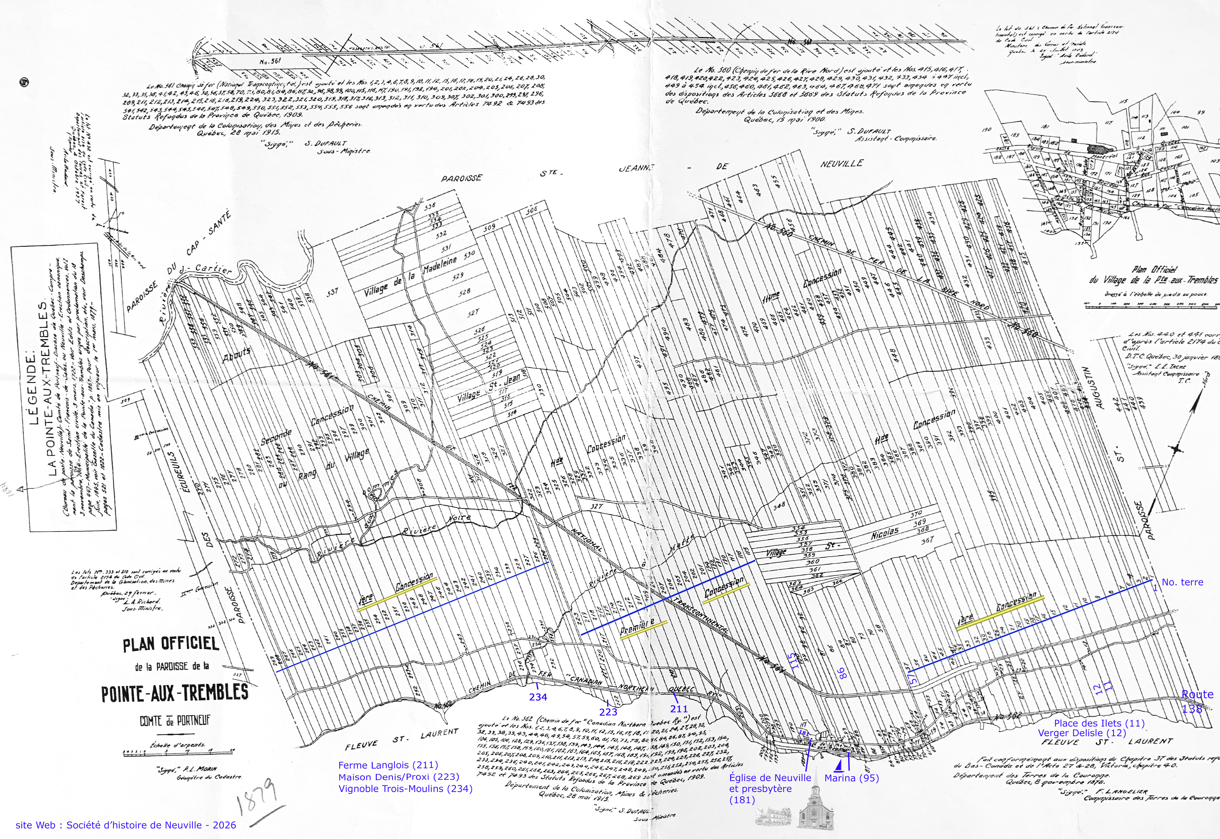 Cette carte de Neuville de 1879 a été établie selon les nouveaux cadastres. Elle identifie les numéros de terre où se sont installés les premiers arrivants sur les premières concessions entre 1667 et 1681. Veuillez cliquer sur la carte suivante pour obtenir le numéro de la concession dans un format agrandi. Vous pourrez alors faire la correspondance avec le tableau 1 ci-après.